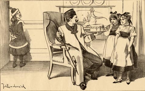 Father Wilhelm (to Alsace and Lorraine): Do you like this pudding? Your naughty Polish sister sticked her tongue out at it and so I have put her in the corner."