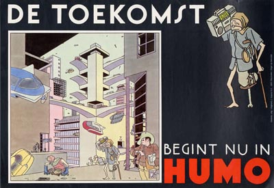 Vooral Joost Swarte en Ever Meulen maakten voor het Belgische radio- en tv-blad HUMO in de jaren '80/'90 fantastische covers, waarvan een aantal ook als affiche (80 x 60 cm.) werden uitgevoerd. Van deze affiches hebben we er nu 30 verschillende voor u verzameld om tentoon te stellen en als we er meer dan één hebben, ook te verkopen.