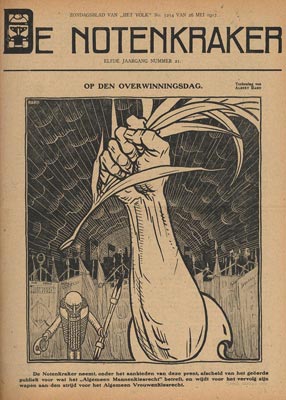 De Notenkraker neemt, onder het aanbieden van deze prent, afscheid van het geëerde publiek voor wat het “Algemeen Mannenkiesrecht” betreft, en wijdt voor het vervolg zijn wapen aan den strijd voor het Algemeen Vrouwenkiesrecht.