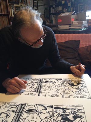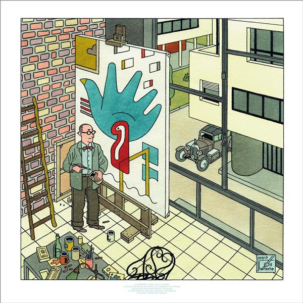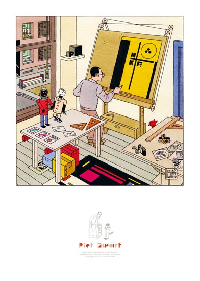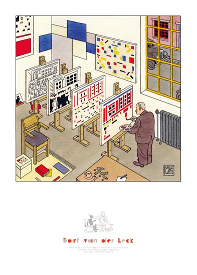 The Gemeentemuseum in The Hague is celebrating this event with exhibitions and also the publication of a book in their series of picture books for children about art and Joost Swarte was chosen to do the book about De Stijl. He drew 10 images of how he thought the studios of De Stijl’s artists would have looked like. In the coming year, we have the intention of making beautiful giclée prints of the 10 drawings Joost Swarte made for this book (see below) and we will also publish posters of the same drawings (see above).