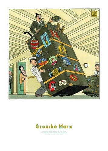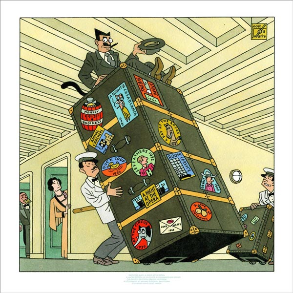 In 2011, Joost Swarte made seven drawings for Gallery Champaka in Brussels, in which he displayed a number of his favourite book and film characters in combination with a means of transport. Of these seven drawings, a portfolio was also made on a small size and with a limited color scheme, called ‘Trafic’.