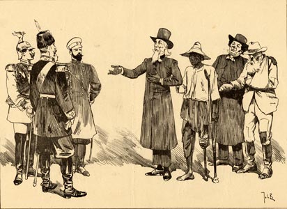Father Wilhelm (to Alsace and Lorraine): Do you like this pudding? Your naughty Polish sister sticked her tongue out at it and so I have put her in the corner."
