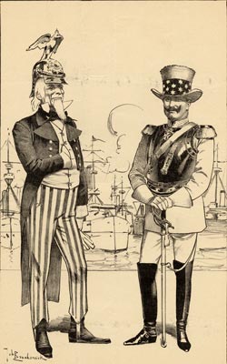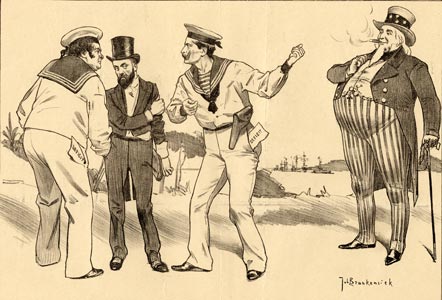 Wilhelm (to John Bull) : We can't take anything of that seedy man; shouldn't we rather take hold of that parvenu overthere (Uncle Sam)?