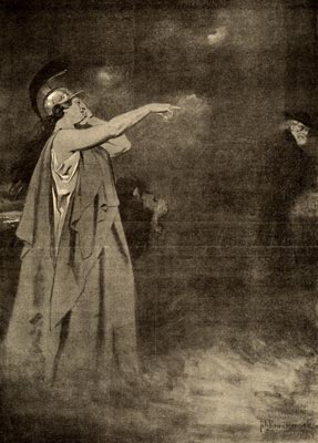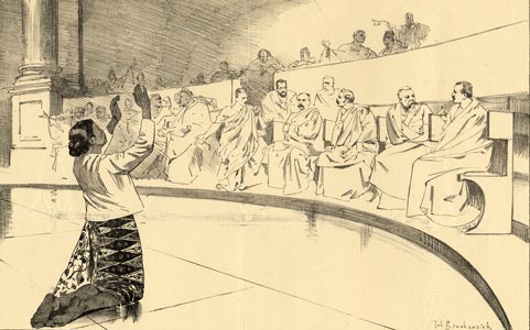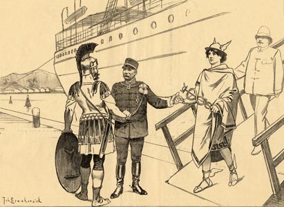 General Van Heutsz (putting the hands of Mars and Mercury together) : My friend Mars, with brave courage and wise conduct you have break a way for Mercury. Now it is up to him to make the rich resources of Atjeh subservient to the prosperity of land and colony!