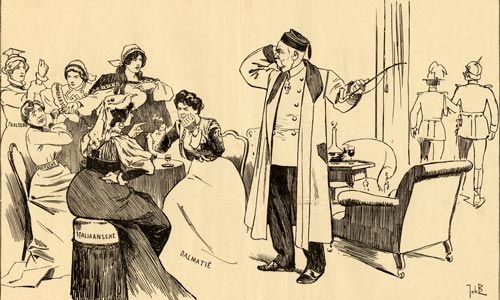 Kaiser Franz Joseph (at his noisy offspring) : Couldn't you be quiet once? Don't you see, my best friends are turning their back at me!