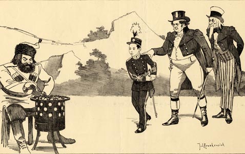 John Bull (to the Japanese) : Little fellow, please pull the chestnuts out of the fire for us, otherwise that Cossack will eat them all.
