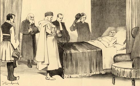 Lamsdorf (to Ferdinand, Alexander and Draga):Now, please be quiet, dear children; don't wake this sick man.