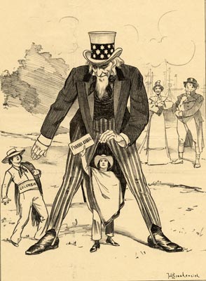 Uncle Sam (to Columbia) : If you want another blow, you just say so, but don't come near this nice little fellow . .