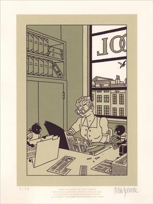 This year marks the 25th anniversary of the passing away of Annie MG Schmidt. This great Dutch poet and writer came to work in 1946 as Head of Documentation on the newspaper Het Parool. Joost Swarte drew a portrait of Annie with her creations Jip and Janneke assisting her. We have now released this portrait of Annie in silkscreen in modern colors.