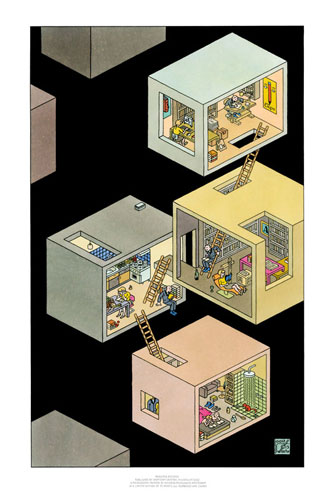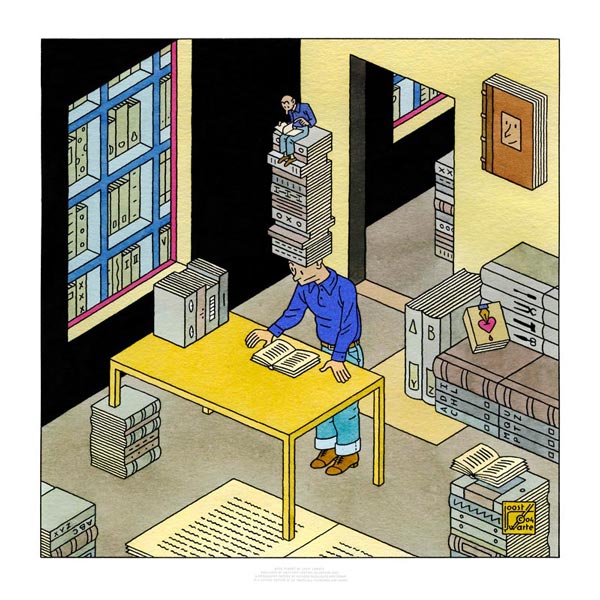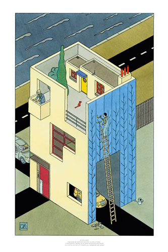 Originally designed by Joost Swarte in 2013 for the Brafa Art Fair as a series of four. One print of it (Living in books) has already been published by the NRC newspaper, and now we have made the three others available: Gravity, Introvert and Reading Rooms.