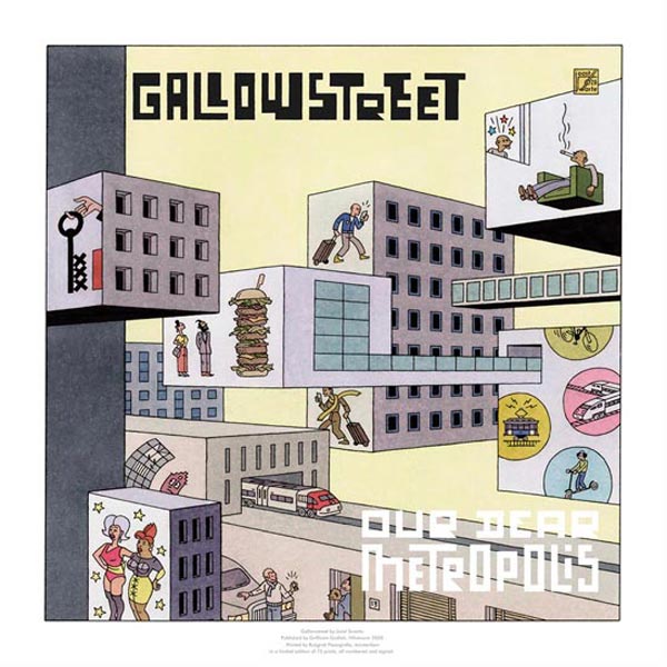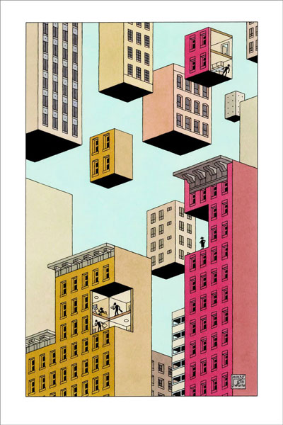 "For the avant garde artists known as STUDIO DRIFT exhibiting in The Shed (the experimental art space in New York City), Dutch designer and cartoonist Joost Swarte conceived as a giclée print a personal interpretation of their work—what he refers to as “a gravity-neglecting concrete block.” Swarte merges the real and surreal city in a delightful fantasy.