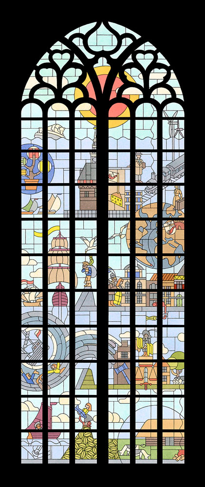 Design by Joost Swarte for a stained glass window of cultural centre Oosterkerk in Hoorn (built as a church in the 16th century).