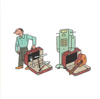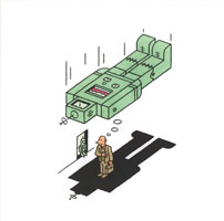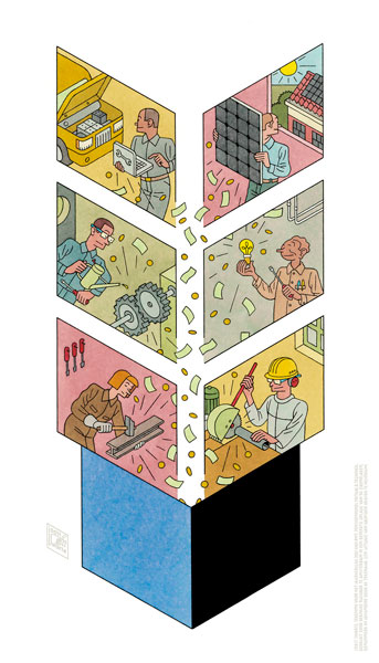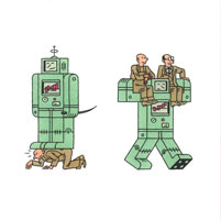 Joost Swarte made illustrations for an article by David Rotman which was published in the MIT Technology Review on June 17, 2015. The article is about the increasing robotization of the economy and its impact on work.
