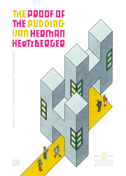 Luxury adapted version of the poster for a documentary about architect Herman Hertzberger. In his drawing, Joost Swarte combined Herman Hertzberger's two H's with his design for the building of Centraal Beheer in Apeldoorn. This iconic office had the option of being converted into homes later on.