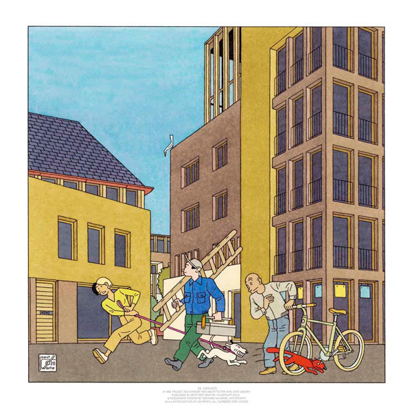 Since the successful involvement of Joost Swarte in the design of the Haarlem theater De Toneelschuur, he has been regularly asked to advise and contribute ideas to architectural projects. A recent example of this is the new construction project De Vierhoek in Haarlem: a housing plan, with a historical story and translated by HER architects and graphic designer and artist Joost Swarte into the present.