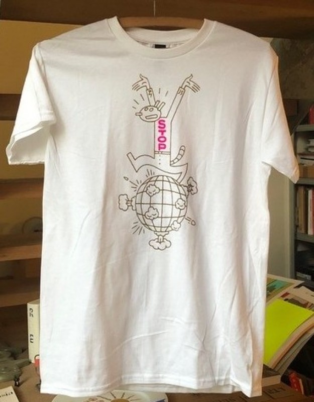 Voor een project van zijn kleindochter, ontwierp Joost Swarte dit t-shirt design. Verkrjgbaar in een wit t-shirt met een zwarte lijn of een wit t-shirt met een donkermosterd lijn.